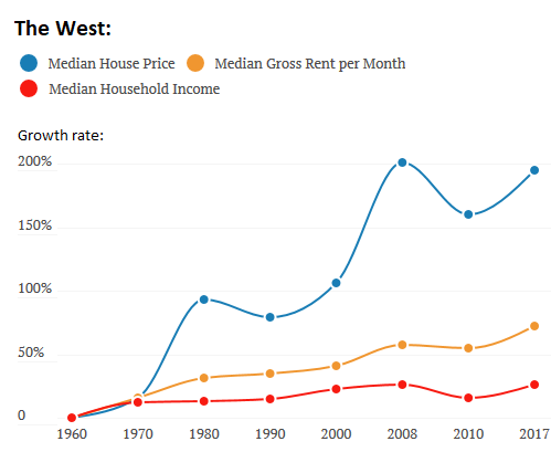 In the West — a vast diverse region that spans Alaska, Arizona, California, Colorado, Hawaii, Montana, New Mexico, Oregon, Utah, Washington, and Wyoming — the median house price, adjusted for inflation, soared 195% since 1960. And rents, adjusted for inflation rose 72%. But household incomes adjusted for inflation ticked up only 26%.