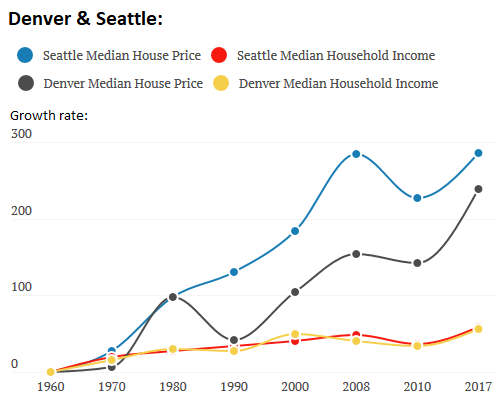 To dissect the changes in house prices and incomes in the West, the study by Clever Real Estate separates out different metro areas. For example, in Seattle and Denver, household incomes, adjusted for inflation, rose in near-lockstep 56% since 1960, while house prices in Denver soared 239%, and in Seattle 286%: