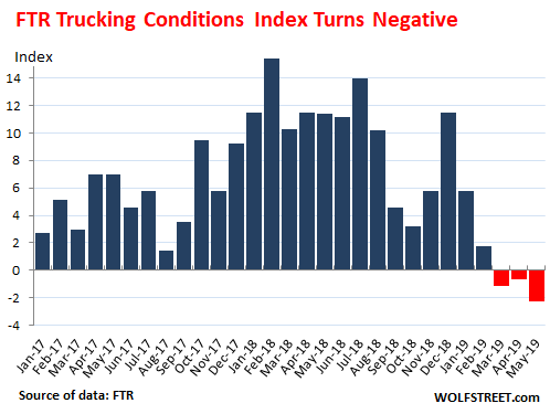 The Cass Freight Index, which tracks shipments of consumer and industrial goods but not bulk commodities such as grains, has now fallen below the June 2014 level. June 2014 had set a record in shipments just before Transportation Recession 1 came along. The boom in 2018 broke the 2014 records, and by a big margin. And now the industry is back in its own recession.