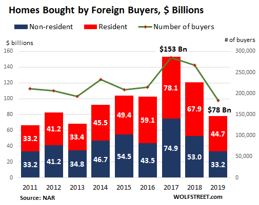 Purchases by all foreign buyers in the period between April 2018 and March 2019 plunged 36% from the same period a year ago and 49% from the period two years ago, from $153 billion to $78 billion, below the level in 2012 – with purchases by Chinese buyers, the largest group, collapsing by 58%.