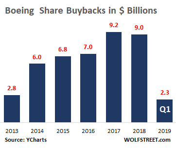 But here we go: From 2013 through Q1 2019, Boeing has blown a mind-boggling $43 billion on share buybacks (buyback data via YCharts):
