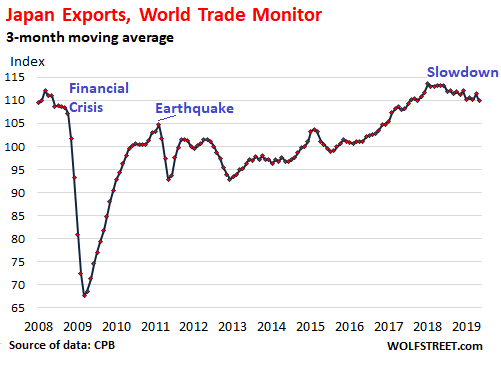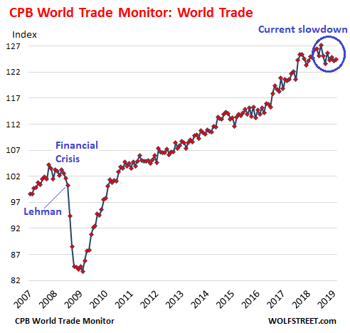 World trade volume – imports and exports of merchandise across the globe – increased 0.3% in May from April, after falling 0.6% in the prior month, according to the Merchandise World Trade Monitor, released today by CPB Netherlands Bureau for Economic Policy Analysis. On a year-over-year basis, the index fell 0.4%. And it is down 2.1% from the peak in October 2018. This isn’t exactly stellar, compared to 2017 and 2018, when the world trade index increased between 2% and 6% year-over-year.