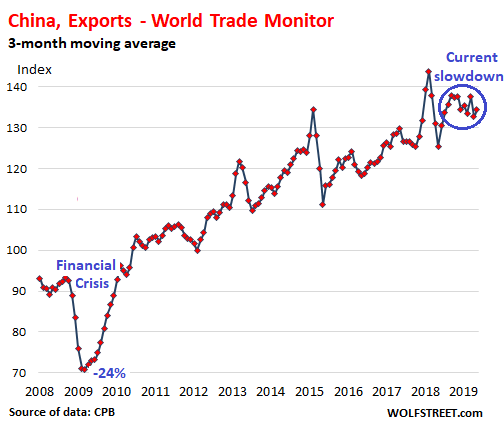 This chart shows exports from China to the rest of the world, according to data from the World Trade Monitor converted to a three-month moving average. Note the 24% plunge during the Financial Crisis: