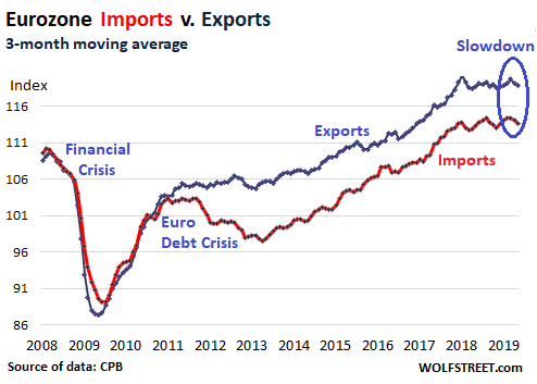 In the Eurozone, there has been some decline in both imports and exports in recent months. While Germany is heavily exposed to the automotive sector and is getting hit harder, other countries such as Greece, Italy, Portugal, and France, are not. Especially in Southern Europe, food exports – such as olive oil, wine, salami, cheese, and other specialty foods – play a larger role among their exports, and there is no slowdown in food products. Also note the impact of the euro debt crisis on imports (red line):