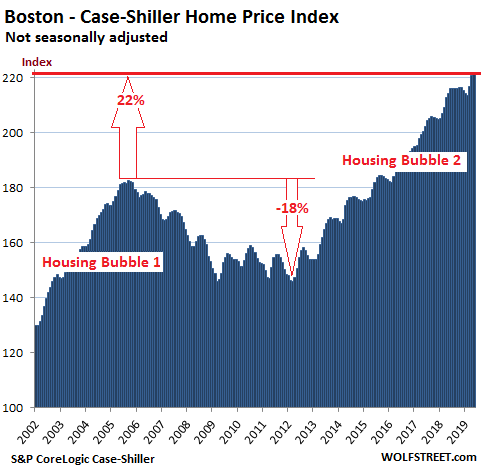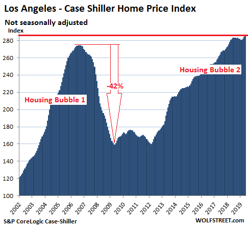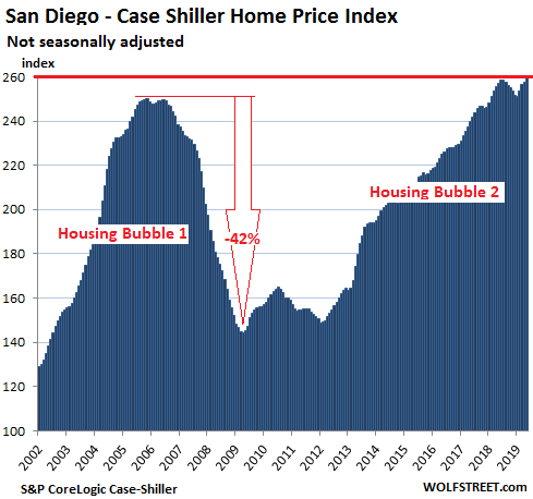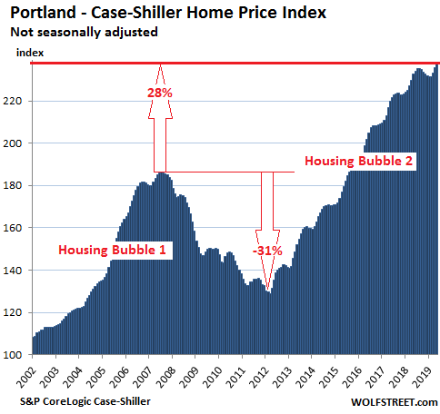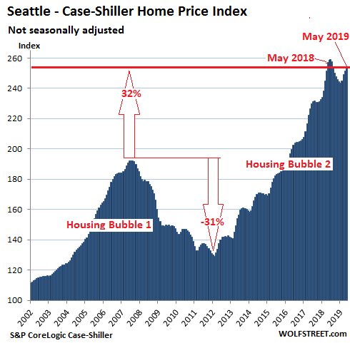 Year-over-year declines have spread to house prices in the Seattle metro, after having cropped up in condo prices in the San Francisco Bay Area and the New York metro in prior months, according to the CoreLogic Case-Shiller Home Price Index released today. These are the first such declines since Housing Bust 1 that followed our fabulous and crazy Housing Bubble 1. In many other markets, year-over-year price gains continued to wither away. So here we go.