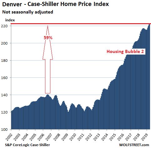 In the Denver metro, house prices rose 0.6% in May from April, and this whittled the year-over-year gain down to 3.6%, the smallest such gain since April 2012: