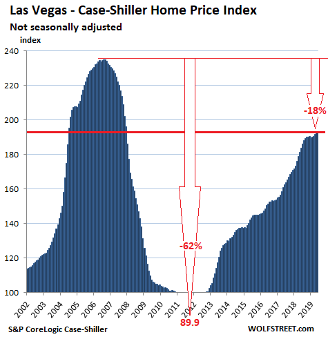 House prices in the Las Vegas metro rose 0.6% in May from April, whittling down the year-over-year gain to 6.4%. As high and out of whack this year-over-year gain may seem, it was the smallest such gain since February 2017, which shows how big the price increases have been. The index remains down 18% from the crazy peak during Housing Bubble 1: