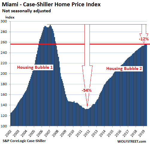 House prices in the Miami metro ticked up 0.4% in May from April and were up 3.8% from May last year. The year-over-year gains in May and April of 3.8% each were the slowest since May 2012. The index remains 12% below the peak of Housing Bubble 1, when the entire housing market turned into a besotted casino, with house prices shooting up 140% in just five years, before they inevitably collapsed. So now the market is desperately trying to get back to those happy days: