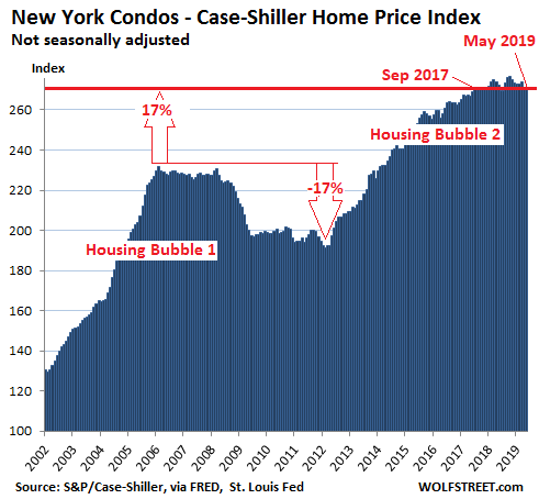 The Case-Shiller Index, which in most cities only covers single-family houses, also covers condos in a handful of big condo markets. The index for condos in the vast New York City metro, instead of booking a seasonal uptick, remained flat in May compared to April. This left the index down 0.3% from May last year, the fourth month in a row of small year-over-year declines. The index is now back where it had first been in September 2017:
