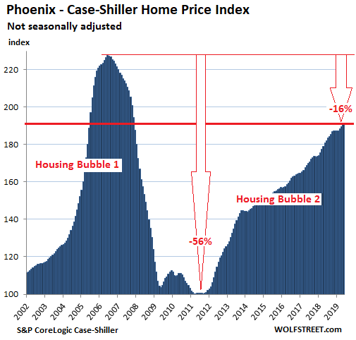 In the Phoenix metro, house prices rose 0.7% in May from April and 5.7% compared to May last year. The Case-Shiller Index remains 16% below its totally nutty peak established during Housing Bubble 1: