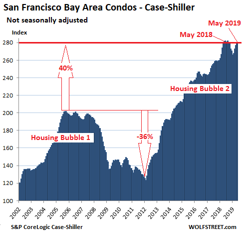 Condo prices in the five-county San Francisco Bay Area – the counties of San Francisco, San Mateo (northern part of Silicon Valley), Alameda and Contra Costa (East Bay), and Marin (North Bay) – rose 1.3% in May from April, according to the Case-Shiller index. But it wasn’t enough. Compared to May last year, prices slipped 0.4%, the third month in a row of year-over-year declines – the first such event since April 2012 at the end of Housing Bust 1: