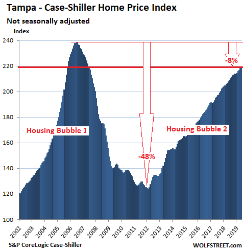 In the Tampa metro, house prices ticked up 0.1% in May from April. This whittled the year-over-year gain down to 5.1%. The index remains 8% below the crazy peak during Housing Bubble 1: