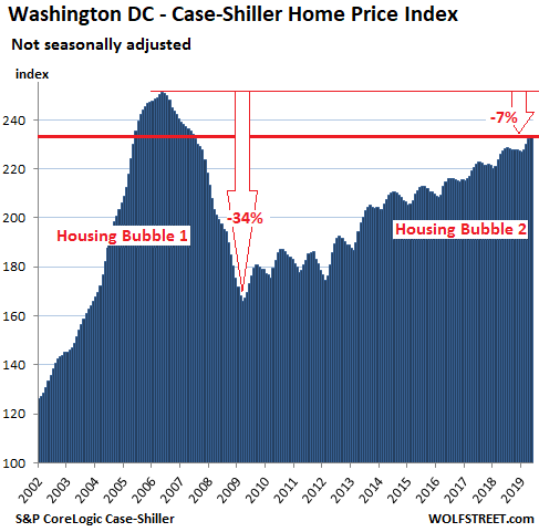 House prices in the Washington D.C. metro rose 0.7% in April from March, and 2.9% from May last year. The index remains 7% below its crazy peak of Housing Bubble 1: