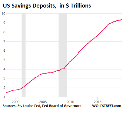 Then there are $9.4 trillion in savings products, mostly savings accounts and CDs at banks. There are also about $3 trillion in checking accounts, payroll accounts, etc., but they’re not included here. These are just savings products.