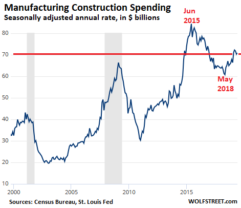 Growth in manufacturing production – what is actually being produced at these plants – is languid at the moment, to put a positive spin on it. And the uptick in construction spending for manufacturing facilities since May 2018 is not in the same ballpark as the surge in early 2015, but it’s mildly encouraging:
