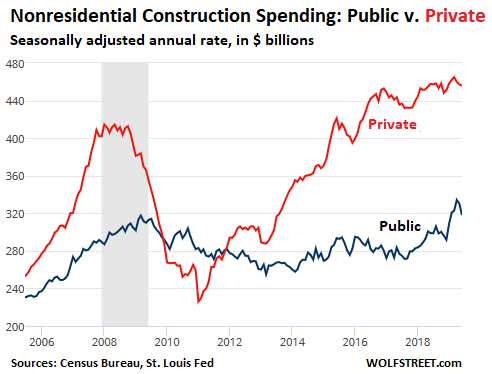 The decline in residential construction spending has been the dominant culprit for weak overall construction spending since mid-2018. But residential construction has stabilized near the $513 billion level during the past five months, and has stopped dropping. Now nonresidential construction spending is getting weak.