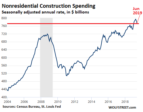 Nonresidential construction spending – which is about 50% larger than residential construction spending and is therefore a lot more important for the economy – had been growing at a decent clip through April, when it peaked at a seasonally adjusted annual rate of $794 billion, a historic record. But over the past two months, spending has dropped on a month-to-month basis, to a rate of $773 billion in June. This reduced the year-over-year gain to just 2.3%: