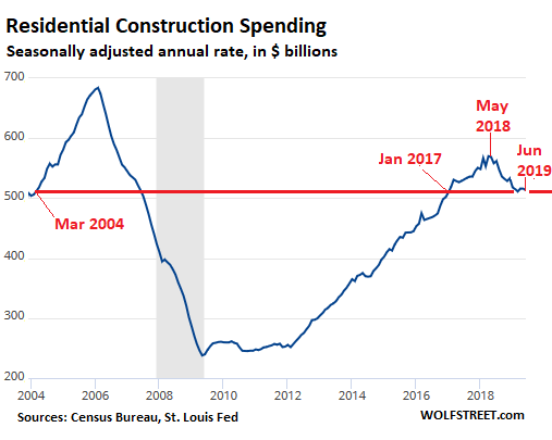 Residential construction spending – 99% is “private” rather than “public” spending – dropped 8% from June 2018, the ninth month in a row of year-over-year declines, to a seasonally adjusted annual rate of $513 billion, back to January and February 2017 levels, and down 10% from the recent peak in April 2018. Note, that residential construction spending never fully recovered from the collapse during the Housing Bust: