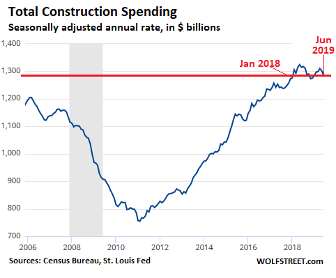 Construction spending, an important part of the US economy, has essentially gone nowhere over the past 18 months – the longest period of drought since the great recession. Total construction spending – residential and nonresidential, private and public – in June fell 2.1% from June last year to a seasonally adjusted annual rate of $1.29 trillion, according to the Commerce Department today.