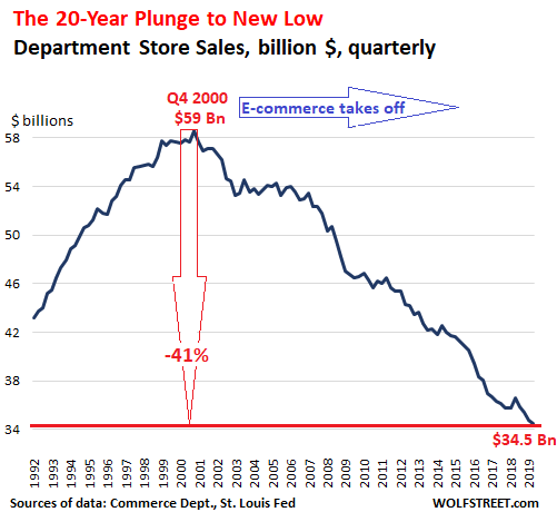 For example, department store sales peaked 19 years ago and have been declining ever since, as department store chains are getting wiped out: