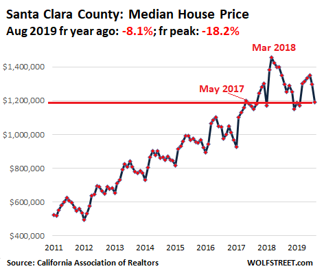Palo Alto is in Santa Clara county. In August, the median sales price of single family houses in Santa Clara County, according to the California Association of Realtors, was down 8.1% from August 2018, and down 18% from the peak in March 2018:
