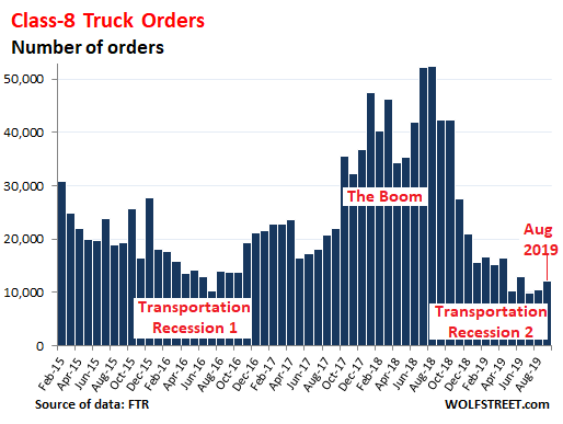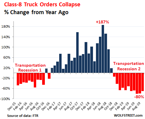 Orders for heavy trucks, after a red-hot period that ended in the fall of 2018, have been in a horrific plunge. In September 2019 compared to September last year, truck makers received about 12,100 orders for Class-8 trucks, down 71% from a year ago, according to preliminary estimates by FTR Transportation Intelligence. It was the 11th month in a row of year-over-year declines, including July and August plunges of 80%: