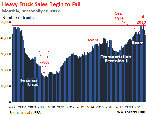 Truck makers recognize a sale when the truck is delivered to the customer, which is months after the truck was ordered. For the industry overall, truck sales, as measured in deliveries, surged during 2018 and into 2019, to hit 47,300 deliveries in July (seasonally adjusted), surpassing the peak before the Financial Crisis, according to data by the Commerce Department.