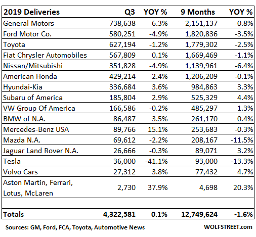 General Motors, Ford, and Fiat Chrysler reported third-quarter new-vehicle deliveries in the US on Wednesday, and Tesla followed with its global deliveries for the quarter on Wednesday evening. Because Tesla doesn’t report deliveries in the US, the industry is stuck with estimating them, and they have plunged in Q3 due to waning demand, and so Tesla is selling its Model 3 production overseas. Other auto makers are still on monthly reporting.