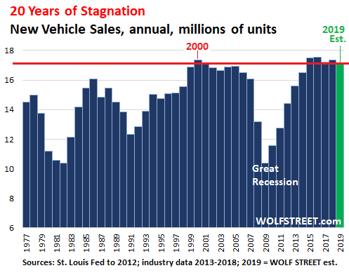 New-vehicle deliveries in the US — fleet and retail combined — were about flat, at 4.32 million vehicles in the third quarter. For the nine months, deliveries were down 1.6%. This puts new vehicle sales on track for about 17 million deliveries in 2019, the worst level since 2014, and below 2000 (17.35 million). This is the nature of a horribly mature market, whose two-decade stagnation was interrupted by the collapse during the Great Recession and the subsequent recovery: