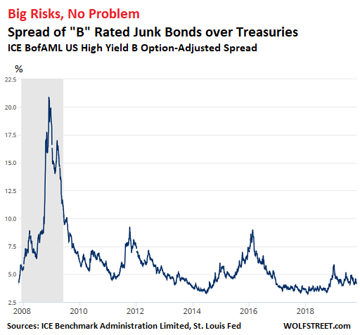 Investors in average B-rated junk bonds currently demand a credit-risk premium of only 4.17 percentage points above the equivalent US Treasury yield, according to the Option-Adjusted Spread of the ICE BofAML US Corporate B Index.