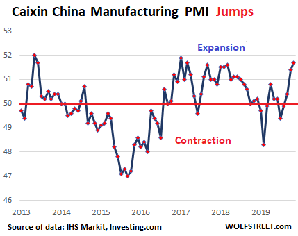 But whiplash. The private-sector Caixin China General Manufacturing PMI showed accelerated growth (51.7), the third month in a row of growth, and the fastest growth since February 2017. Production rose. New orders grew at the fastest rate in over six years as domestic demand grew “solidly,” and new export orders bounced back into growth mode for the first time in five months. And yet, “staffing levels declined further, with the rate of job shedding quickening since September”: