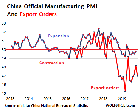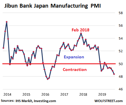 The export-focused manufacturing sector in Japan slid at the fastest rate in 40 months, according to the Jibun Bank Japan Manufacturing PMI, at 48.4 for October, contracting for the sixth month in a row. New orders were “the primary reason underpinning this marked decline,” with manufacturers reporting “the sharpest fall in demand since May 2016.” The “accelerated drop was broad-based across consumer, intermediate and investment goods”: