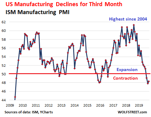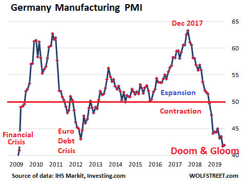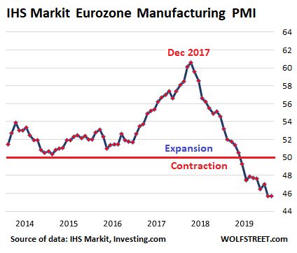 The doom-and-gloom situation in Germany, the largest economy in the Eurozone, is dragging down the overall manufacturing sector of the Eurozone, with the preliminary IHS Markit Eurozone Manufacturing PMI remaining deeply in contraction mode, at 45.7 for October, same as in September, the ninth month in a row of shrinkage: