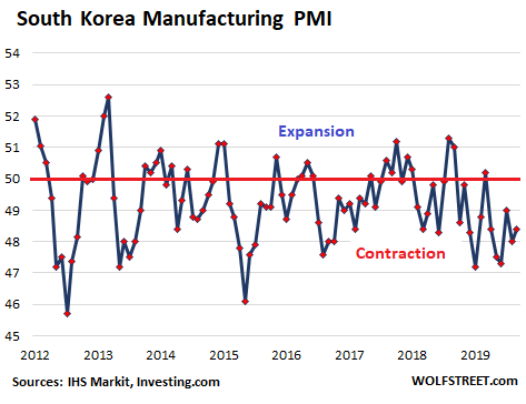 South Korea is in distant fifth place behind the big four manufacturing countries China, the US, Germany, and Japan. The executives of South Korean companies are a rather negative bunch, giving the IHS Markit South Korea Manufacturing PMI the peculiar look of a manufacturing sector shrinking much of the time since 2012 (with the majority of PMI values below 50). In October, the PMI of 48.4, while up a tad from September, signaled “challenging operating conditions.”