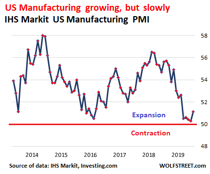 These “Purchasing Managers Indices” (PMIs) are based on how a panel of executives of manufacturing companies – names are not disclosed – see various aspects of their own businesses, such as new orders, production, and employment. Values over 50 mean growth (the more the value is above 50, the faster the growth); values below 50 mean contraction.