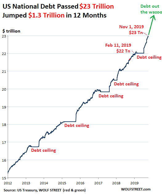 The US gross national debt – the sum of all Treasury securities outstanding – passed another illustrious milestone, $23.01 trillion, the US Treasury department disclosed on Friday. And it got there at lightning speed just eight months after having passed the illustrious milestone of $22 trillion on February 11. Over the past 12 months, the US national debt has jumped by $1.33 trillion – and these are the good times, and not a financial crisis when everything goes to heck: