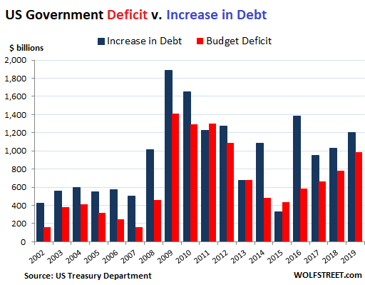For example, in the fiscal year 2019, ended September 30, the “budget deficit” was $984 billion, according to the Treasury Department. This is a huge number, considering that these are the good times. But the government had to borrow an additional $1.2 trillion over the same period. In other words, the actual cash deficit, as represented by the increase in the debt, was $219 billion higher than the government accounting of the deficit.