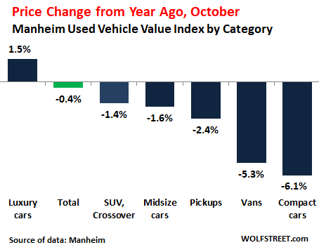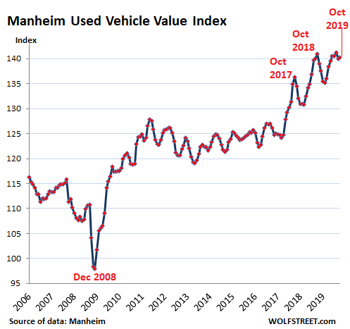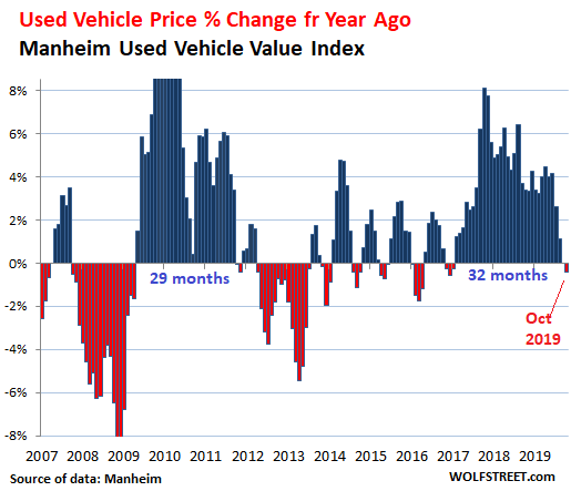 Used-vehicle prices in October at wholesale auctions around the US experienced the first year-over-year decline after 32 months in a row of gains, inching down 0.4% from October 2018, according to the Used Vehicle Value Index by Manheim, the largest auto-auction house in the US, running about 8 million vehicles through its auctions a year. The index is adjusted for mix, mileage, and seasonality.