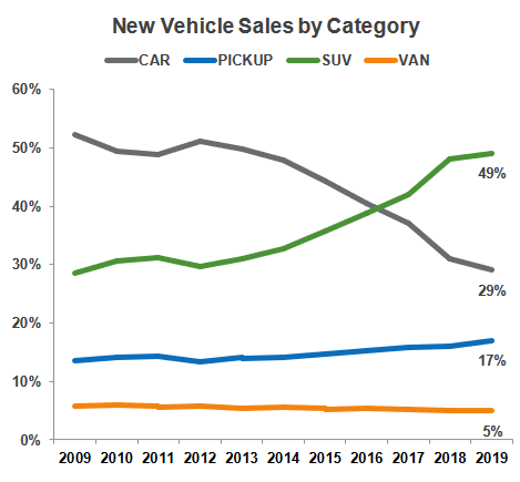 - The share of new cars plunged from 52% of total new vehicle sales in 2009 to about 29% in 2019.