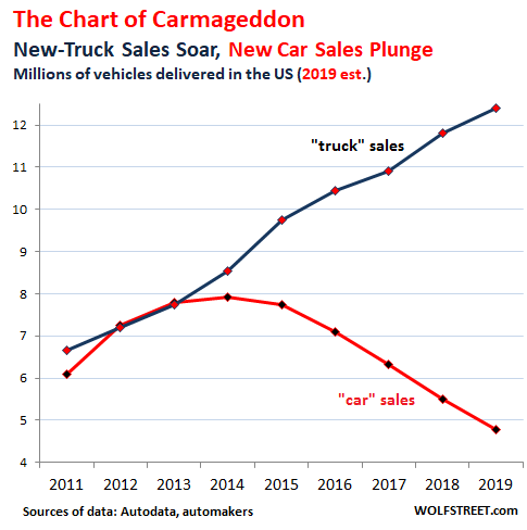 For years, I’ve been discussing what I call “Carmageddon,” the collapse of new car sales, as Americans have switched to buying new vehicles that are classified as “trucks” — SUVs of all sizes, including compact SUVs though they are based on car chassis and drivetrains; pickups; and vans. The chart below displays Carmageddon, with my estimate for 2019 based on new-vehicle sales through Q3: