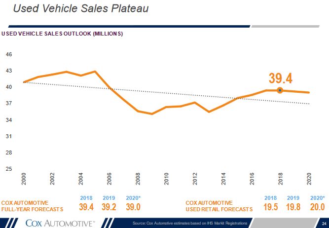Total used vehicle sales volume, which includes wholesales, rose 1.4% year-over-year in October to a seasonally adjusted annual rate of 39.6 million vehicles, according to estimates by Cox Automotive, which owns Manheim. Cox estimates that for the full year 2019, used vehicle sales will come in at 39.2 million, down from 39.4 million in 2018. The hope for used vehicle sales to once again reach 40 million units for the full year is becoming increasingly distant.