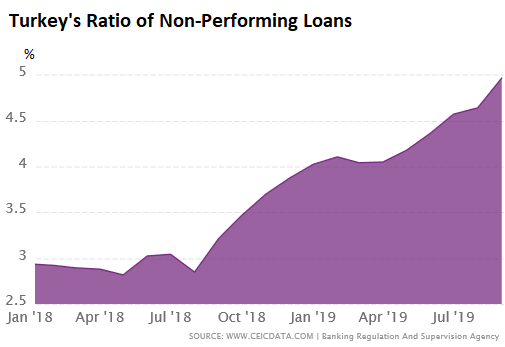 Despite all the assistance provided by Turkey’s state-owned bad banks, the NPL ratio of Turkey’s regular banks reached 5% in September for the first time since 2010. Through mid-2018, before the crisis was beginning to bite, the NPL ratio was mostly around 2.8%. It is expected to rise to 6.3% by the end of this year, according to Turkey’s banking watchdog, the BDDK (chart via CEIC):