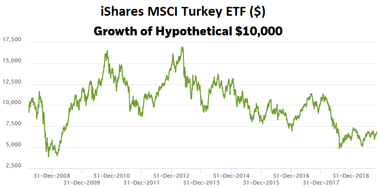 This is the kind of nonsense that kills me. You’re probably looking at an index denominated in Turkish Lira. But the lira has collapsed. Here is an 11-year chart of Turkish stocks in US dollars: