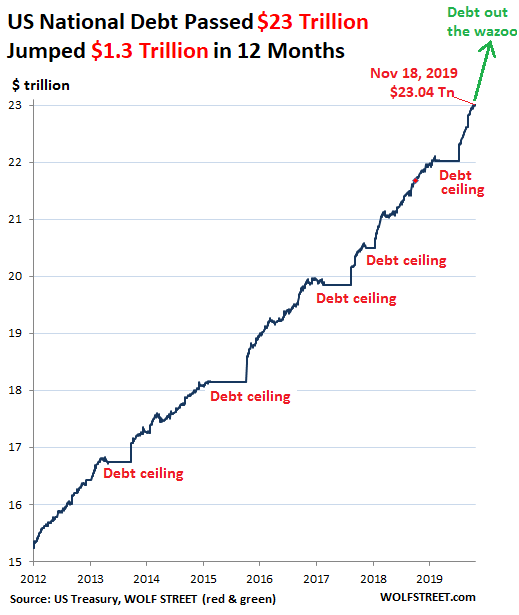 The US Gross National Debt has jumped by $1.28 trillion as of today, compared to 12 months ago, to $23.04 trillion. And these are the good times. The economy is rocking and rolling, we’re told. How will this debt balloon during the next economic downturn? Yes, that was a rhetorical question. It’s better to not even think about it. And no one is thinking about it: