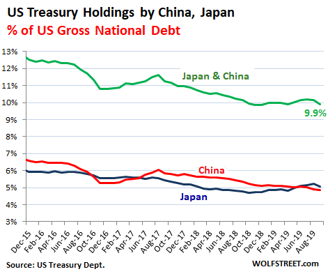 The relative importance of Japan and China as creditors to the US has been declining gradually for years, as the US debt has ballooned. Their combined share has dropped to 9.9% of the total US debt: