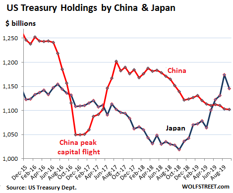 All foreign investors combined – “foreign official” holders such as central banks and foreign private-sector investors of all stripes – dumped $84 billion in US Treasury securities in September. But compared to September 2018, their holdings were up by a massive $551 billion.