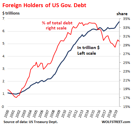 And it includes banks that are not among these primary dealers, bond funds, pension funds, hedge funds, businesses with cash balances that they don’t want to keep in a bank, private equity firms and distressed-debt funds keeping their powder dry until opportunities arise, and individual investors via their accounts at Treasurydirect.gov or at their broker. In short, American institutions and individuals held 34.1% of the huge and ballooning pile of US gross national debt: