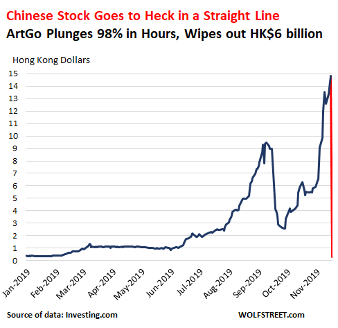 ArtGo Holdings, a Chinese company that mainly quarries marble and processes it into blocks and polished slab and that has recently been trying to expand into Chinese real estate with funds raised by issuing more shares, is now infamous because its shares, traded in Hong Kong since 2013, became this year one of the best-performing stocks in the world, with a 3,800% surge, from 0.38 Hong Kong dollars on January 2, 2019, to HK$14.8 at the close on Wednesday, giving it a market capitalization of HK$45 billion ($5.6 billion). And today the stock collapsed by 98% (red line to heck) to HK$0.30 before trading was halted a tad too late: