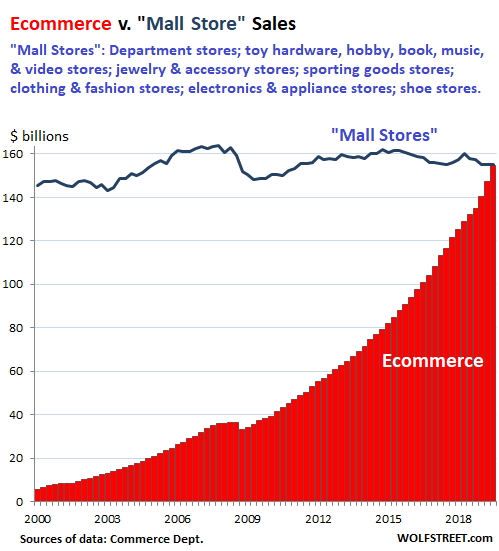 Obviously, ecommerce sales are broader and encompass more categories than mall stores. But this comparison summarizes the trend.