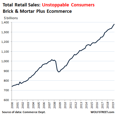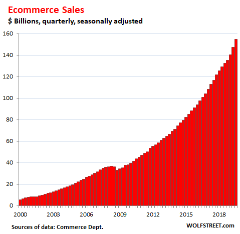 Ecommerce sales in the third quarter 2019 spiked 17.3% from a year ago to $145.7 billion, not seasonally adjusted, according to the Commerce Department. On a seasonally adjusted basis, sales hit $154.5 billion. Ecommerce sales will exceed $600 billion in 2019, double the amount five years ago. In dollar terms, ecommerce sales jumped by $20.4 billion in Q3 compared to a year ago, the biggest dollar-jump in the history of ecommerce: